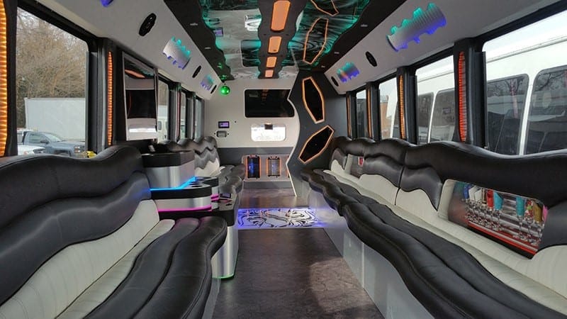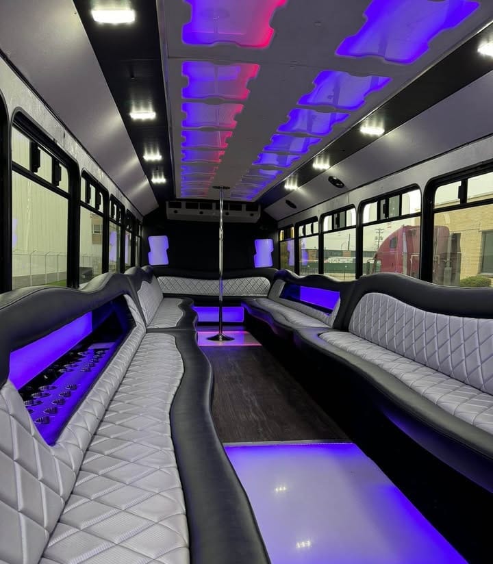 Step inside our party bus and discover a world of premium features designed for your enjoyment. Each party bus for 40 Person is equipped with plush leather seating, vibrant LED lighting, and a top-tier sound system to keep the party going. Enjoy onboard entertainment with flat-screen TVs, Bluetooth connectivity, and ample space to dance or relax.