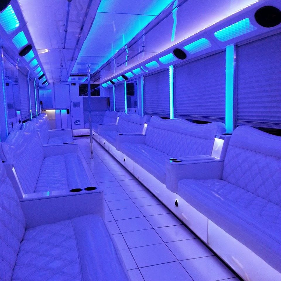 Our 40 passenger party buses are designed to provide a luxurious and entertaining environment for your group. Standard amenities include plush leather wraparound seating that comfortably accommodates all passengers, built-in wet bars stocked with ice bins and glassware for your refreshments, and onboard restrooms for convenience during longer trips. The buses feature customizable LED and laser lighting systems to create the perfect party atmosphere, along with premium Bluetooth sound systems that allow you to stream your favorite music seamlessly. Multiple HDTV screens and karaoke setups provide entertainment options, while spacious dance floors give your group room to move and celebrate. Climate control and privacy window shades ensure comfort and discretion throughout your ride.