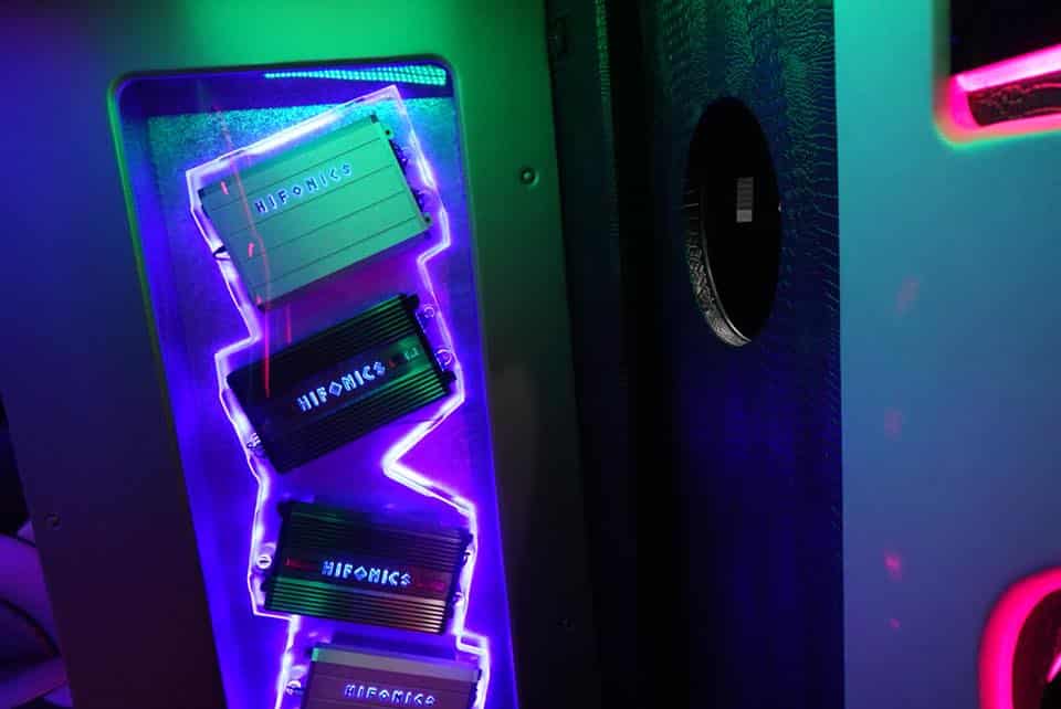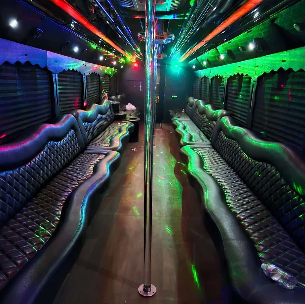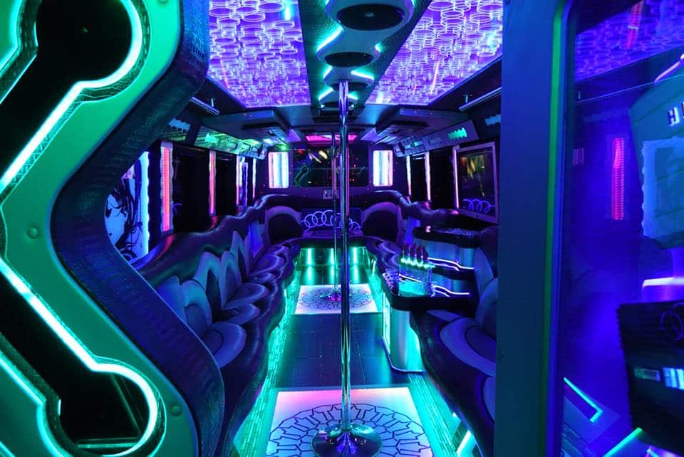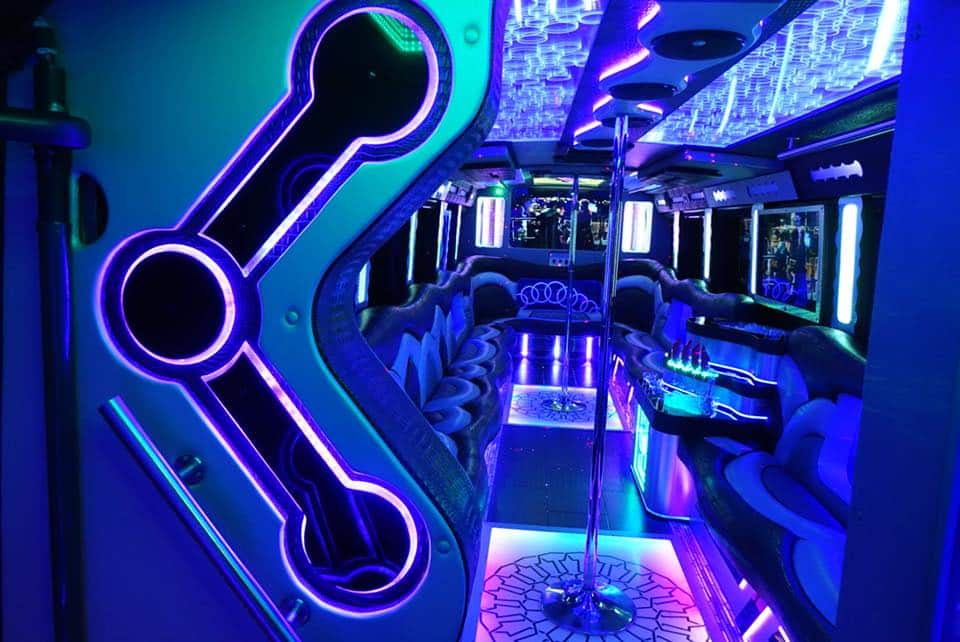 The bus includes luxury leather seats, a high-quality surround sound system with Bluetooth, vibrant LED and fiber optic lighting, multiple flat-screen TVs, a spacious dance floor, and an onboard bar with ice and cup holders.